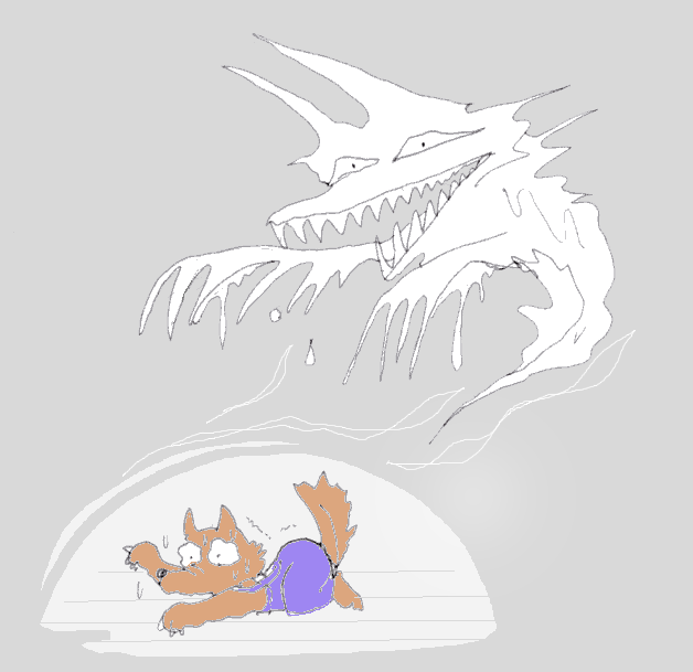 ボンちゃん、こわくて逃げ出そうとしますが、腰が抜けております。 ど・・どどど・・・どうしよう。はやく逃げないと・・・