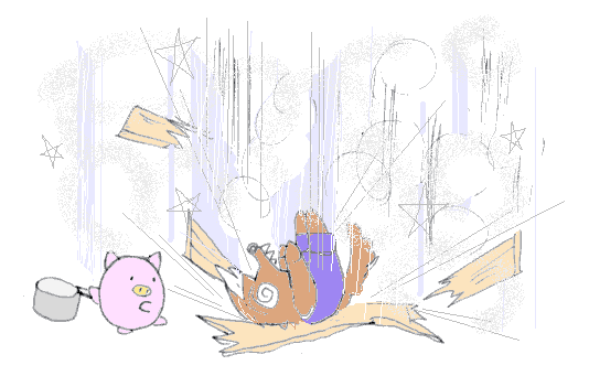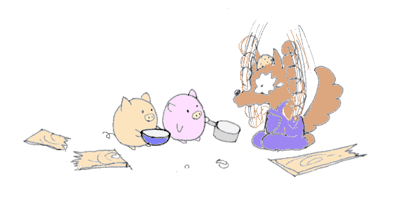 「ボンちゃんっ!」 ぷくちゃん、びっくりしました。 「なにしてんの?」 「何してんのじゃあるかーーっ! この天然おとぼけコブタどもがっ! そんな武器で、勝てるかーっ!」